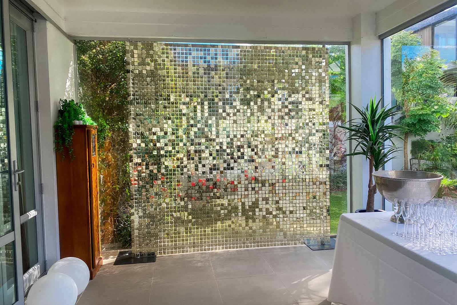 The white gold shimmer wall is truly a sight to behold. Its shimmering surface adds a touch of elegance and glamour to any event, making it a popular choice for a variety of occasions. Whether you're planning a wedding, corporate event, or private party, this stunning wall is sure to be a show stopper. Its versatility and beauty make it an excellent backdrop for photos and videos, allowing guests to capture memories that will last a lifetime. Overall, the white gold shimmer wall is an excellent choice for anyone looking to add some sparkle and sophistication to their next event.